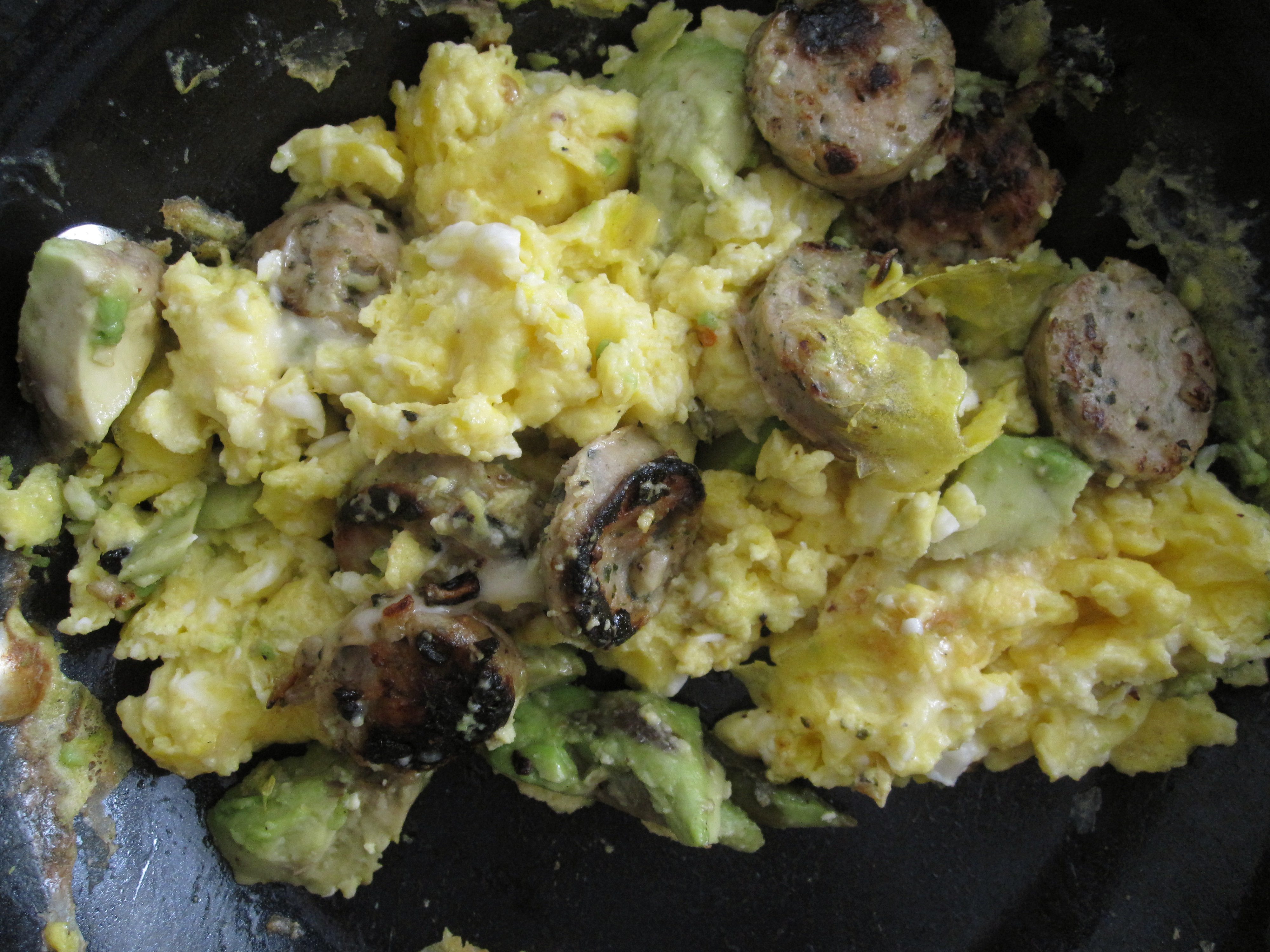 In a separate pan, saute sausage. Maybe throw in a (hot?) pepper. Mix eggs w. a small amount of milk (Do you know that apparently eggs w. less liquid are more creamy?). Add salt & pepper. Heat other pan (Another trick- your supposed to cook them over low heat), add butter. Add eggs. Start to scramble. After they take shape, add sausage and cheese. When done, take off heat, and quickly mix in avo.