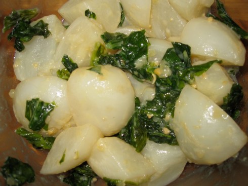 Add greens gradually, turning and coating as volume reduces. Cover and cook another minute. Uncover and continue to boil, stir occasionally, until turnips tender and liquid reduced to a glaze- about 5 mins [mine took only a minute or two]. Stir in miso butter and cook one more minute.