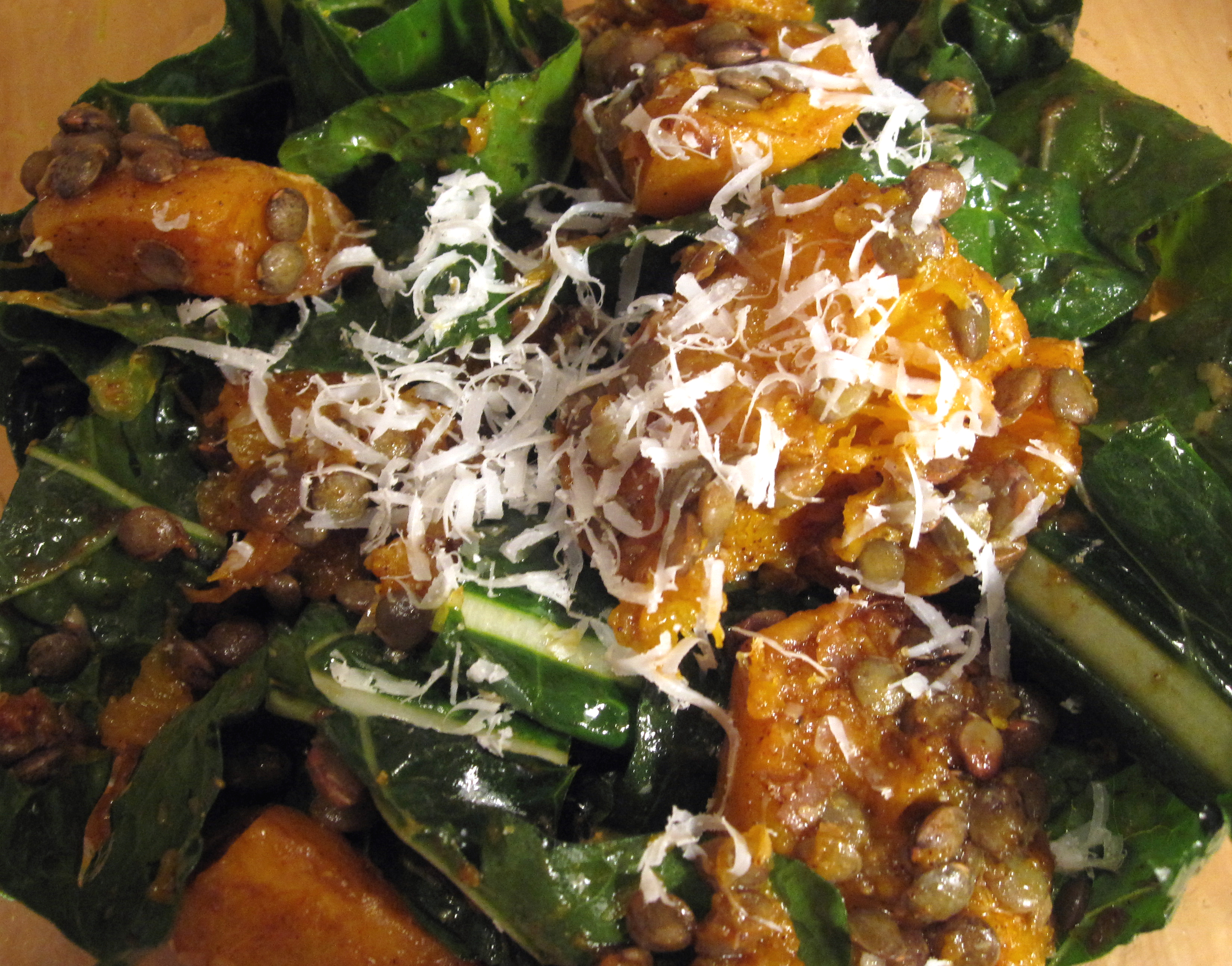 Combine lentils, squash and kale. Add the last 1 tablespoon of oil and vinegar. If using goat cheese, add half now- and serve w. the other half on the side. Season w. salt, pepper and extra vinegar to taste.
