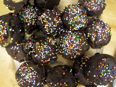I first had these at Kevin & Sarah’s place.  They made cake pops- I bought the sticks and all– but during my first pop- i gave up and decided to go w. cake balls.  I used vanilla cake and frosting– but you can go w. whatever– chocolate, red velvet etc. Baking chocolate is the way to go for dipping because it hardens well.  I ran out- and tried w. semi sweet chocolate chips- but that was much messier.  Sprinkles are a great way to dress them up- and cover up those imperfections.  There is something so delicious about the cake box/store bought frosting– reminds me of my youth– and with all the preservatives these keep very well.