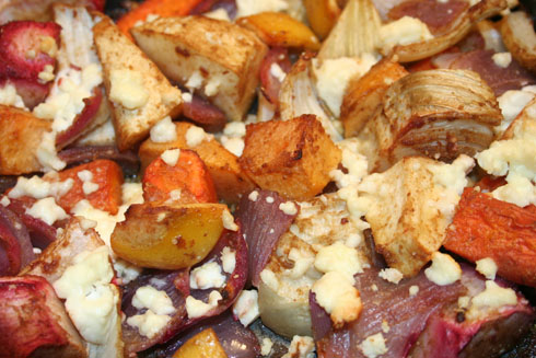 Put all the all veg and lemons in a baking dish. Pour the spiced oil over the vegetables and toss to coat. Bake for 30 minutes. Sprinkle feta cheese over the top and bake until the vegetables are caramelized and soft, another 15 minutes.