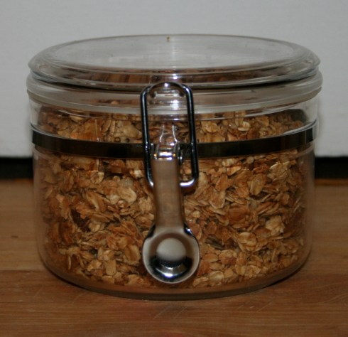 When you can’t find a recipe on the internet, it’s time to experiment. This is sort of a melding of a Bobby Flay and an Epicurious recipe. I am into the idea of making your own granola, but I hate that it can be so packed with sugar. This uses agave nectar instead of some of that sugar- but still has the right amount of sweetness. This recipe is very adaptable, so go crazy. I enjoyed some w. milk- and some in a giant bowl w. greek yogurt, maple syrup, pomegranate seeds, bananas and raspberries- delicious. If you are having people over for brunch you could, as mrs. weiner suggests, make into pretty parfaits- layering the yogurt, berries and granola.