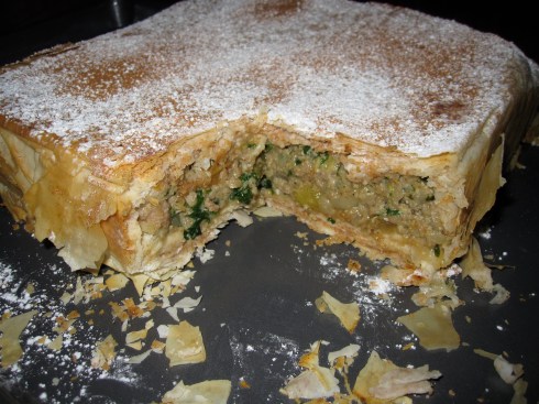 Recipe says you can assemble 4 hours ahead of time and chill (but I feel like might as well assemble right before you bake). Bake b’stilla in oven until tops and ends are puffed and browned, 15 to 20 minutes. Cool b’stilla slightly on a rack. Flip out onto a serving dish. Generously sprinkle b’stilla with confectioners’ sugar and cinnamon and serve warm.
