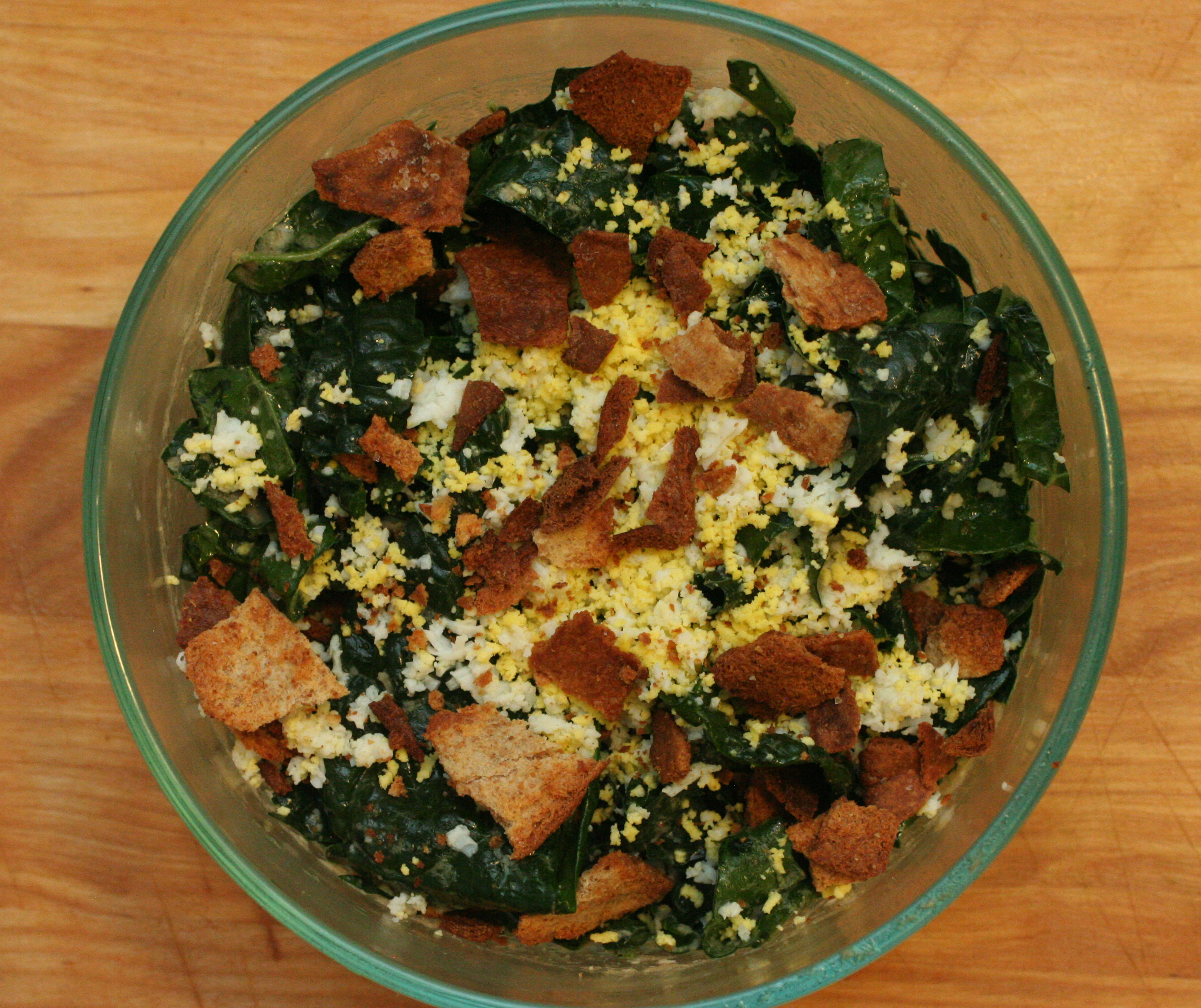Kale Caesar is a staple at Sam’s house. This recipe was first sent to me by Lan— and i love it. Instead of having egg in the dressing, you push hard boiled egg through a mesh strainer and use as a topping- and it is actually quite gorgeous. You can also- as I have- made pita chip croutons- as inspired by a different salad that I saw on Chuck’s Day Off. But if you are too lazy– and not in the fussy mood- as Sam & E & I were last week– you can quickly throw together just the kale and dressing. Tastes good too if you let the kale sit w. the dressing for a little bit, softens it up.