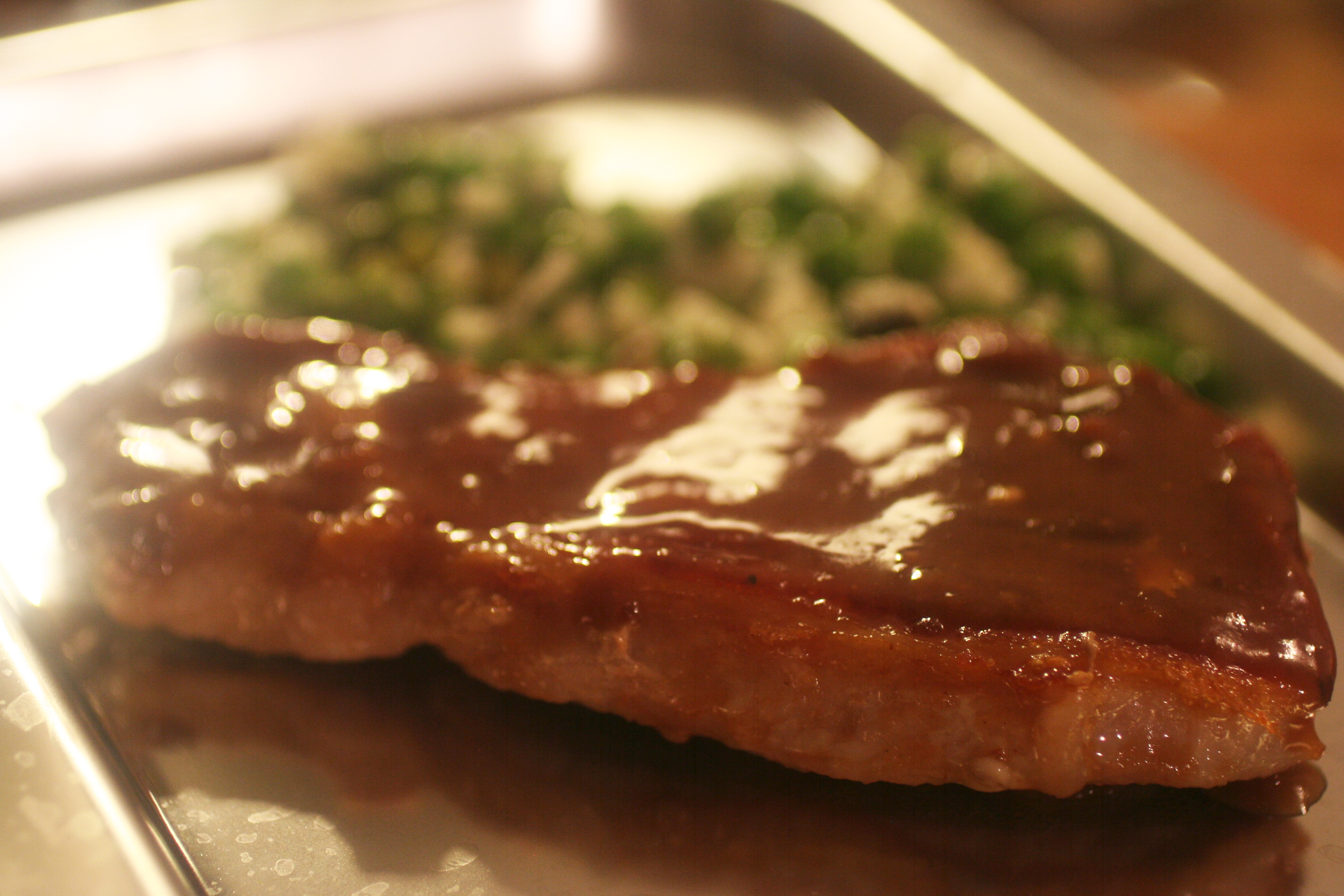 Somehow I have fallen out of the habit of creating a quick weeknight dinner– but this is just that. Not counting the 30 mins it took to defrost the pork chops in my freezer [remember the defrost trick- put meat in a ziplock and submerge in hot water]- this whole recipe takes maybe 15 minutes. And I always love meals that can be made from things laying around the cupboard. Now perhaps it is the frozen peas/rice/bacon accompaniment I served it with- or the silver US Airways dinner trays I have- but this really reminded me of a retro TV dinner- in the best way possible. Had I had them though- I think some roast brussel sprouts would have been a perfect side dish. And maybe some… dare I say, mashed sweet potatoes? Talk about a fall meal.