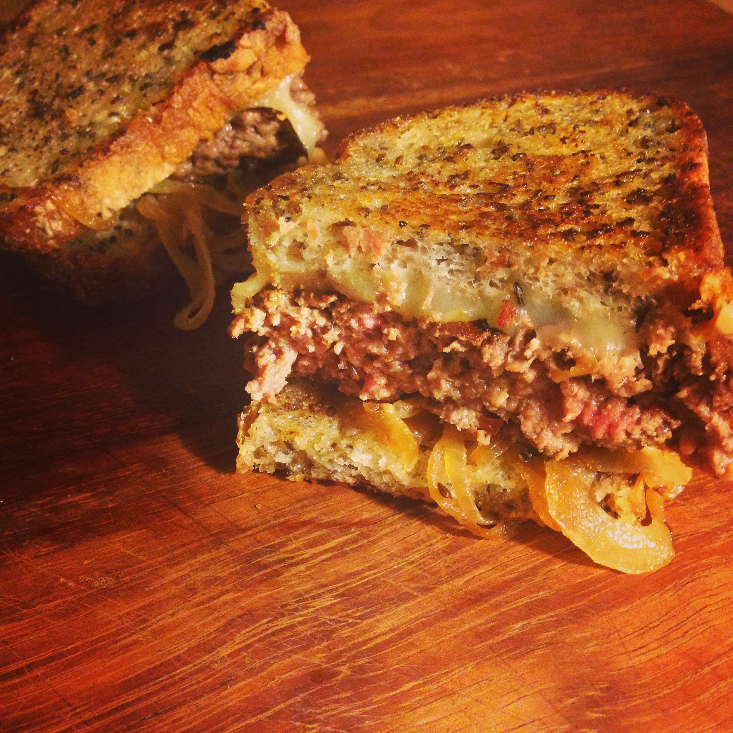 Take your bacon. If it is not coming from the freezer already, put it in there for 20 mins. [snacko backo tip- when i buy bacon i seran wrap it 2 piece bundles for freezer]. Meanwhile, take a dry skillet and toast the caraway seeds about a minute and a half- will become fragrant. take off heat and put them aside. take your onions, thinly slice them [mandoline is helpful here if you have one]. Put a tablespoon and a half of butter on skillet on med-high heat. Melt butter. add onions. Cook for a 3-5 mins until they slightly brown. add 1 1/4 tsp of salt [3/4 prob enough]. and reduce to med-low for another 10 mins to caramelize. Then. take off heat. Now- take that bacon from your freezer. chop it in 1/2 slices and put it in a food processor until crumbly and ground. In a medium bowl- put bacon, ground beef, mustard, worcestchire, garlic powder, pepper, 1 tsp salt. Mix [with your hands] and form patties. the patties – i did three- should be kinda long and flat- like the shape of your bread. Now- on skillet- put remaining 1/2 tablespoon of butter [really, you don’t need more because bacon and beef fat comes out.] Cook 5 to 6 mins total. A nice crust will form. I did 3 mins each side, i think. Take off heat. Clean skillet. Then, take your rye bread. If making two sandwiches, take all four slices of bread and spread mayo on one side of each. Pick up a slice in your hand- mayo side facing your palm. Add cheese, patty, and pile and onion. Put on top bread- mayo is facing out on both sides. Heat clean pan on medium. Throw your sammy down. Cook four to 5 mins per side- to get it nice and golden and melt the cheese.