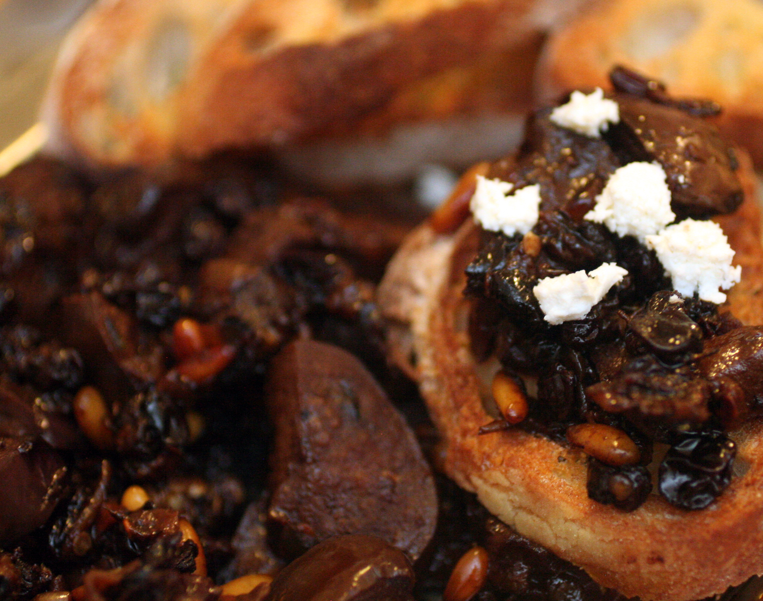 Cut baguette into slices. Drizzle w. olive oil and toast in the over for a few minutes. Serve together. I also served w. Ricotta Salata (a salty cheese pictured above) but this is not really necessary.