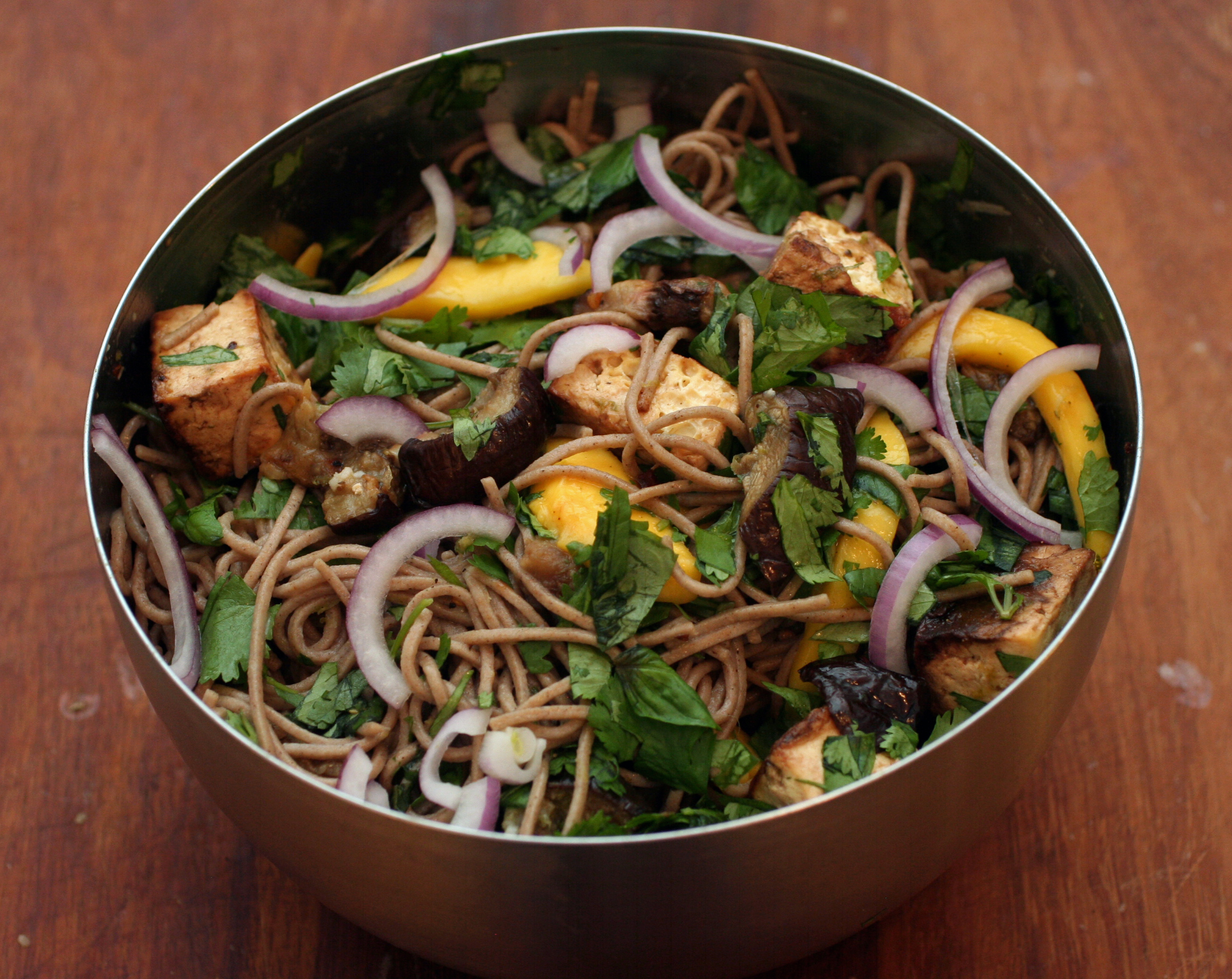 I fear you have become like a long lost pen-pal. That I should begin every post with apologies for not writing more. I could give excuses- and say, that i’ve been lazy– that i’ve started, as chrissy would say “to make food” more than cook. Or that- in perhaps a growing comfort in the kitchen- i’ve relied less on recipes– and become more like the people i used to despise— using a dash of this and glug of that. measurements too imprecise to pass on to you, dear reader. But instead of these quibbles, i will offer you something better. A recipe. This comes from the Ottolenghi cookbook- Plenty- which happens to be vegetarian- Special Thanks to Kara– who gave me this cookbook for my last bday. This recipe is easy to put together— but it tastes like something i’d be willing to pay for in restaurant. the author says his mother loves to show off with it when she has guests over. the combination of eggplant and mango- with a lime-spiked dressing is refreshing- perhaps characteristic of a summer dish. boston is cold. but fuck it, this shit tastes good.