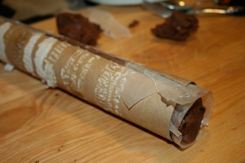 3. Log cookies. This is a tip from Doris Greenspan. When you are making slice and bake cookies, you need to form the log refrigerate for a couple hours. If you just wrap it in cellophane, then the you are going to get one flat side where it rests in the fridge. So what you do, is take a paper towel roll, cut it down the middle. The ease of getting the dough in there- depends on how sticky the dough is. If it is crumbly and dry it is much easier. Just form dough into a log shape on a big sheet of wax paper. Roll it around to make a smooth log. Fit it in tube. Or if the dough is super sticky, you can just line the roll with the wax paper and spoon the dough in. Once it is full, wrap it up w. packing tape. Then wrap the whole thing in cellophane.