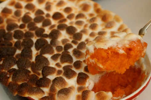 Preheat oven 375. Prick the potatoes with a fork.  Place directly on rack in over- no baking sheet. Cooking 1 hour (few minutes more or less depending on size of potatoes) until they are soft.  Wait a few minutes until cool enough to handle.  Skins peel off quite easily.  Mash with fork (or potato masher if you have, I don’t.)  While hot, mix in all other ingredients.  Put in baking dish.  If re-heating cook for about 30 minutes to heat through. If potatoes already hot might take less time. Add a layer of marshmallows, and turn oven to broil for a minute- until toasted. Watch closely they will burn!
