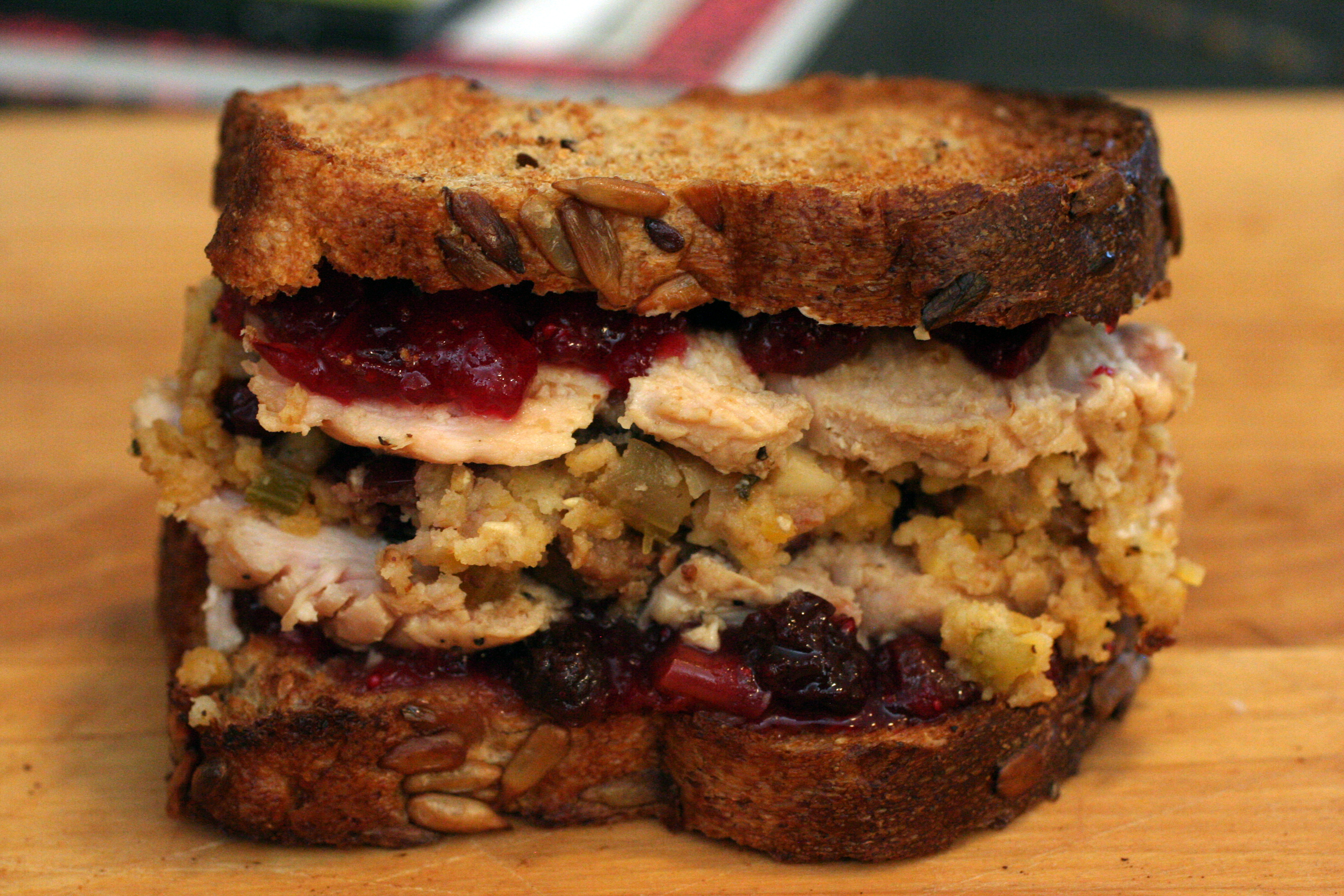 In junior high, my class went on a ski trip to Bolton Valley.  Dana C. and I were in the commissary at the Black Bear Inn, and she ordered a cinnamon bun the size of her face.  When she finished, she stood up and shook her hands in victory, as an imaginary crowd cheered on.  It was with such joy and sense of accomplishment, that I ate the most magical sandwich. Just as we come together with friends and family on Thanksgiving, so too do the fruits of many days labor, join in celebration– between two slices of seven grain bread.  To elucidate the layers: a delicate schmear of brie- adding just a touch of creaminess, a spoon of sweet/tart cranberry sauce, a slice of fresh roasted turkey breast, a heap of cornbread sausage stuffing— and back again- turkey, stuffing, cranberry, brie, toast- piled high.